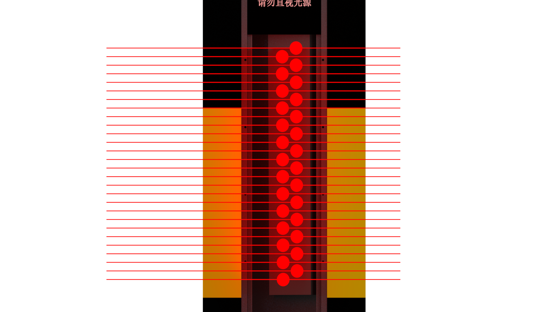 在與廠家技術人員溝通得知,該機采用激光+紅外的雙感知方案,激光燈組由日立原封28顆激光燈(200毫安)組成,以扇形90度投射激光線,激光燈上下間隔1CM,激光燈組整體高度為26CM,激光不會直射人眼。行人感應器有效探測范圍20米。還具有傾斜保護和行人近距離保護功能,當激光樁意外傾斜或有行人靠近激光燈范圍30cm以內時,激光燈關閉,起到一個很好的保護行人的作用。