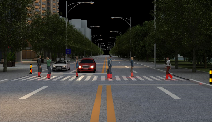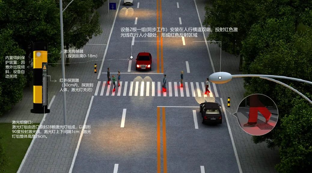當(dāng)行人即將進(jìn)入斑馬線的瞬間,該設(shè)備探測(cè)到行人并投射28條紅色激光線到行人小腿處,形成“紅靴子”投影,這樣即使機(jī)動(dòng)車駕駛員在遠(yuǎn)處也能得到警示,做到及時(shí)避讓前方行人。